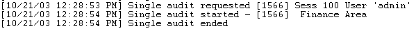If a single audit is initiated on a conference (in this case, Finance Area), the console output message will look like the following:
