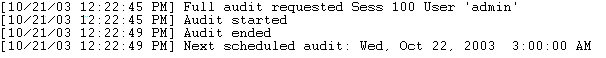If a full audit is initiated by the admin using the Admin menu, the console output message will look like the following: