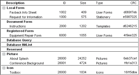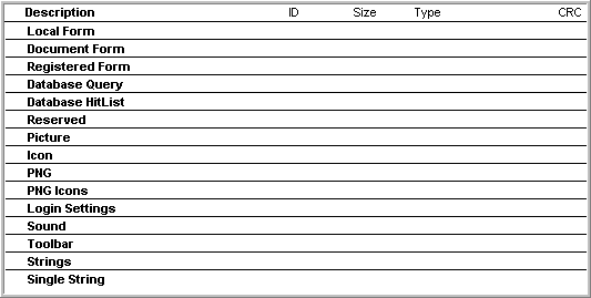The resource name. Resources are grouped by resource category (for example, Local Form). You can expand or collapse resource categories by clicking the tree view buttons (Windows) or disclosure triangles (Mac). |