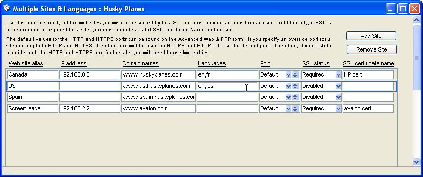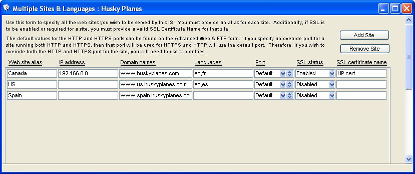 Each site has a different alias name (but same IP address) corresponding to a different site container in the WWW folder. All the domains resolve back to the same IP address. Since each site supports different languages, we entered the language ISO codes in "Languages".
