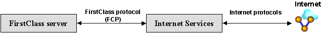 Internet Services bi-directionally translates FirstClass formatted data from the server into the appropriate protocol for the Internet and back again. The diagram below shows this relationship: