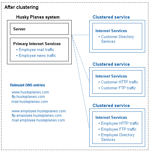 In this scenario, we decided to put all SMTP traffic on a cluster. This way, all other services (for example, HTTP, FTP, and so on) can run more efficiently on our primary Internet Services machine.